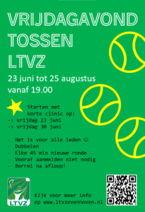 We kunnen weer gaan tossen op vrijdagavond! Het start op 28 juni en loopt door t/m 23 augustus. Iedereen die op vrijdagavond zin heeft om te tennissen kan gewoon langskomen en meedoen. Zo speel je ook eens tegen iemand anders dan jouw vast maatjes en kan je kennismaken met andere clubleden. Dat kan op de …