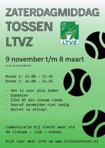 We gaan weer tossen op zaterdagmiddag, de eerst keer is op zaterdag 9 november. De toss is een goede mogelijkheid om via tennis kennis te maken met andere (nieuwe) clubleden. Tijdens de toss wordt er zoveel mogelijk ‘gedubbeld’, in steeds wisselende samenstellingen. Er wordt 45 minuten gespeeld en daarna worden de teams opnieuw ingedeeld. Voor …