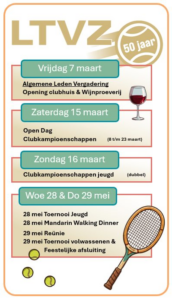 Het nieuwe tennisseizoen bij LTVZ gaat alweer bijna van start. De KNLTB competitie start op zondag 1 april, dan spelen onze jeugdteams hun eerste wedstrijden. De volwassenen beginnen op vrijdag 5 april en zaterdag op 6 april. In de eerste week van april start ook de nieuwe reeks tennislessen. Meld je op tijd aan als …