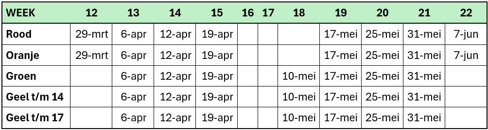 De voorjaarscompetitie indeling zal voor het eind van het jaar worden gemaakt, hier staat een tabel met de speeldata. Zet ze alvast in je agenda 😊 In overleg met Gilbert wordt iedereen ingedeeld in het best passende team. Heb je wensen voor de competitie? Zijn er data die je niet kan spelen of wil je helemaal niet meedoen? Laat dat dan weten zodat we kunnen proberen er rekening mee te houden.