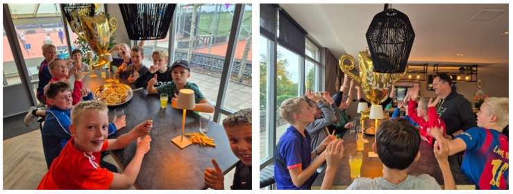 De jongens de kampioen zijn geworden hebben samen een patatje gegeten en meteen gezongen voor Gilbert zijn verjaardag.